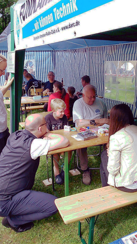 Der Bastel- und Lötstand war eine der Attraktionen, die gestern (10.06.) auf der Kindermeile im Rahmen der Holstenköste im Rencks Park in Neumünster stattfand. Fünf Lötplätze wurden von den OV-Mitgliedern betreut, an denen Kinder und Jugendliche unter Anleitung Blinkschaltungen, Kurzwellenradios, einen elektronischen Würfel oder eine LED-Taschenlampe zusammenbauen konnten. Der Erlös aus den verkauften Bausätzen kam dem SOS-Kinderdorf in Norderstedt zugute. Wie die Ortsverbandsvorsitzende, Rita DH8LAR berichtet, waren die Basteltische ständig umlagert und von aktiven Mädchen und Jungen besetzt, die stolz ihre selbstgebauten Errungenschaften mit nach Hause nehmen konnten.