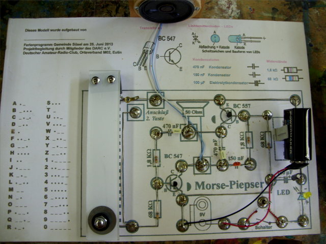für sechs Kinder, bei dem im Werkraum der Schule Morsetasten in Reißnageltechnik zusammengebaut werden sollen. Die selbst gebauten Dinge können die Kinder am Ende des Basteltages mit nach Hause nehmen, die Teilnahme ist für die Kinder kostenlos. Am Mittwoch (23.08.) gibt es einen Funktag, an dem Amateurfunkbetrieb auf UKW und Kurzwelle mit 13 Kindern durchgeführt wird.