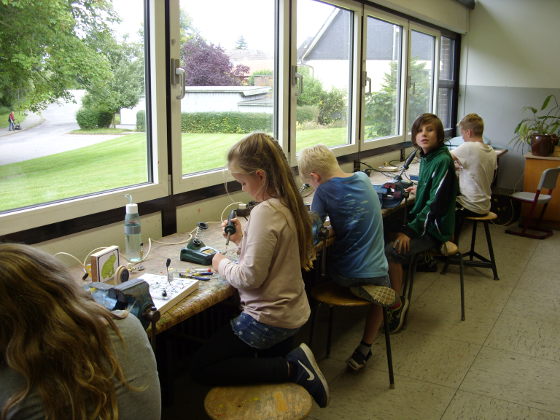 An gleich drei Tagen betreuten Mitglieder des DARC-Ortsverbandes Eutin (M02) die Ferienpassaktion bei der Offenen Ganztagsschule in Süsel bei Eutin. Am vergangenen Montag nahmen 14 Schülerinnen und Schüler an einem Funkpeilwettbewerb teil, der großräumig rund um das Schulgelände stattfand. Am Dienstag hatten sechs Kinder zwischen 8 und 11 Jahren die Möglichkeit, einen Morsesummer mit Morsetaste in Reißzwecken-Löttechnik aufzubauen. Ich hatte die Gelegenheit, diese Gruppe im Werkraum des Schulzentrums zu besuchen. Wir hatten gemeinsam viel Spaß und unter der Anleitung von Gertrud DK8LQ und Horst DJ9FC konnten alle Teilnehmer ihr Lötprojekt bis zum finalen Funktionstest erfolgreich zu Ende führen. Am Mittwoch gab es dann gemeinsamen Funkbetrieb, hierzu hatte man mit den Kindern Stationen für Kurzwelle und UKW auf dem Schulgelände aufgebaut. Hier fand sich auch Rita DH8LAR ein, um mit den Kindern QSOs zu fahren. Es war sehr schön, die Begeisterung der elf interessierten Kinder und Jugendlichen zu beobachten, eine Teilnehmerin konnte binnen kürzester Zeit das Buchstabieralphabet auswendig und sogar rückwärts.